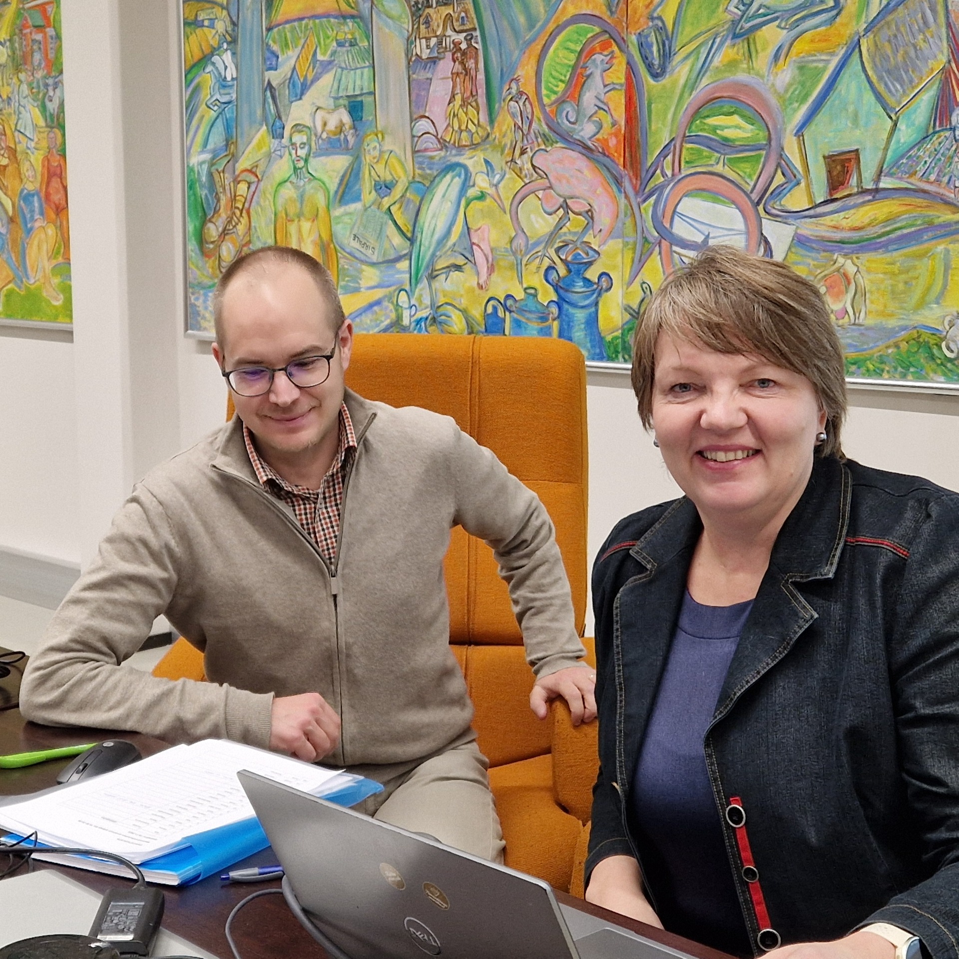 Terhi Latvala ja Olli Voutilainen valmistautumassa Haapajärven valtuustosalissa työpajan työskentelyyn