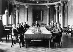 A.K. Cajanderin I hallitus (virkamieshallitus 2.6.–14.11.1922) viimeisessä presidentin esittelyssään. Pöydän päässä presidentti K.J. Ståhlberg. Kuva: K. J. Ståhlbergin säätiö