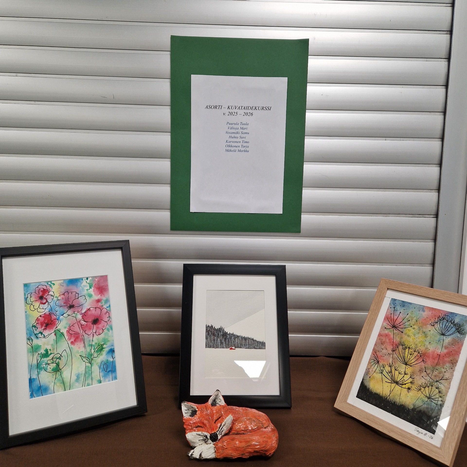 Näyttelyvieraan ottaa vastaan asorti-kuvataidekurssilaisten työt. Talven aikana piirissä on ahertanut seitsemän harrastetaiteilijaa.
