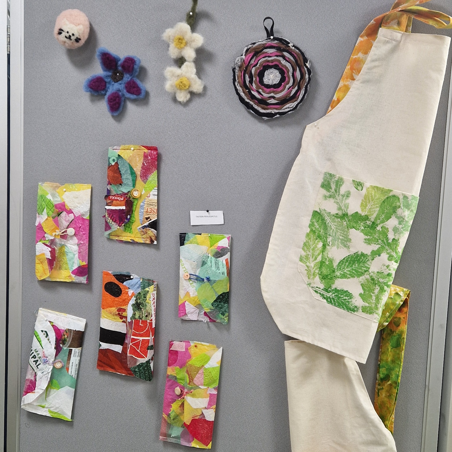 Lasten kuvataide- ja käsityöpolkujen värikkäät työt ovat esillä alussa näyttelytilan vasemmalla puolella.