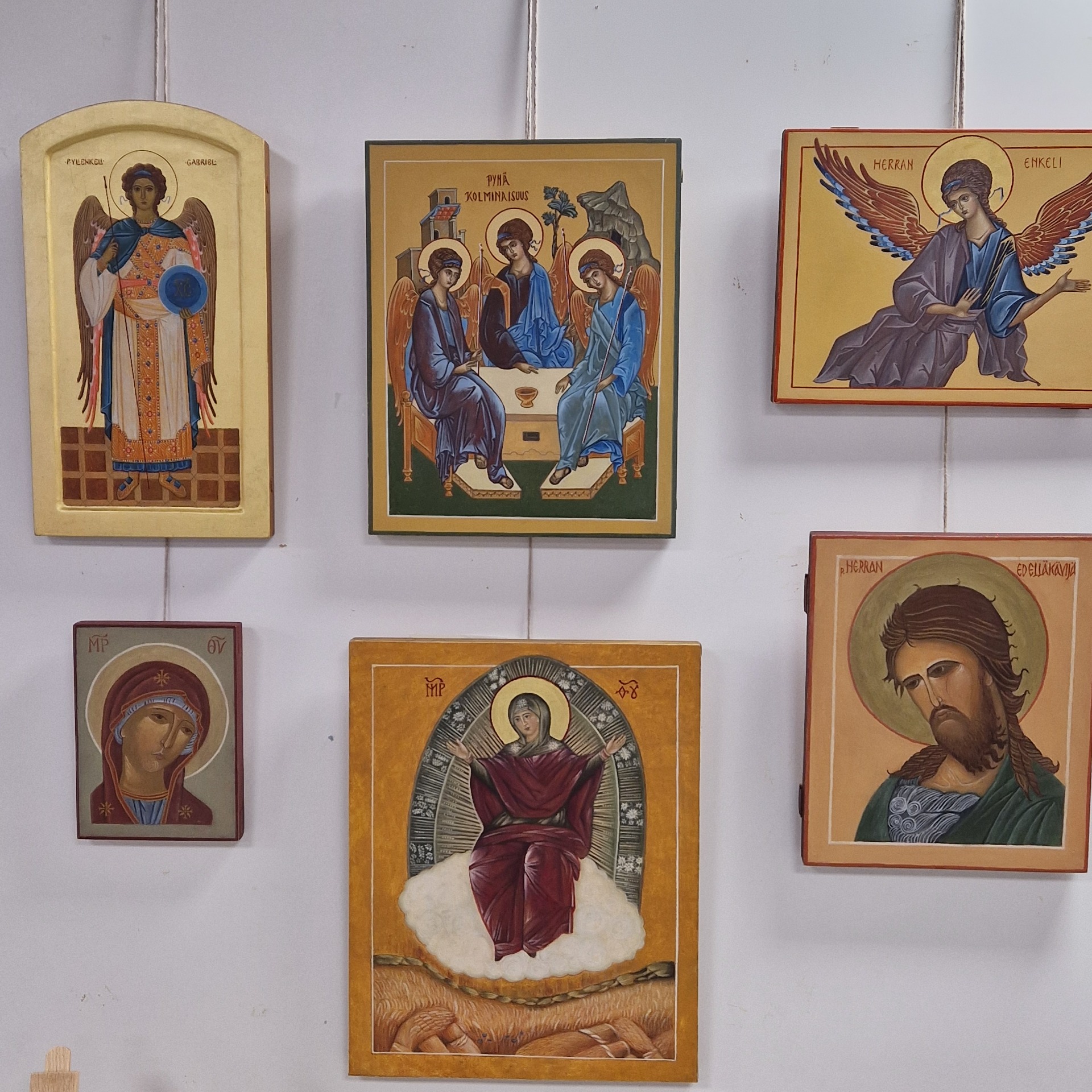 Vastapäätä lasten töitä on muun muassa ikonipiirin taidokkaita töitä.