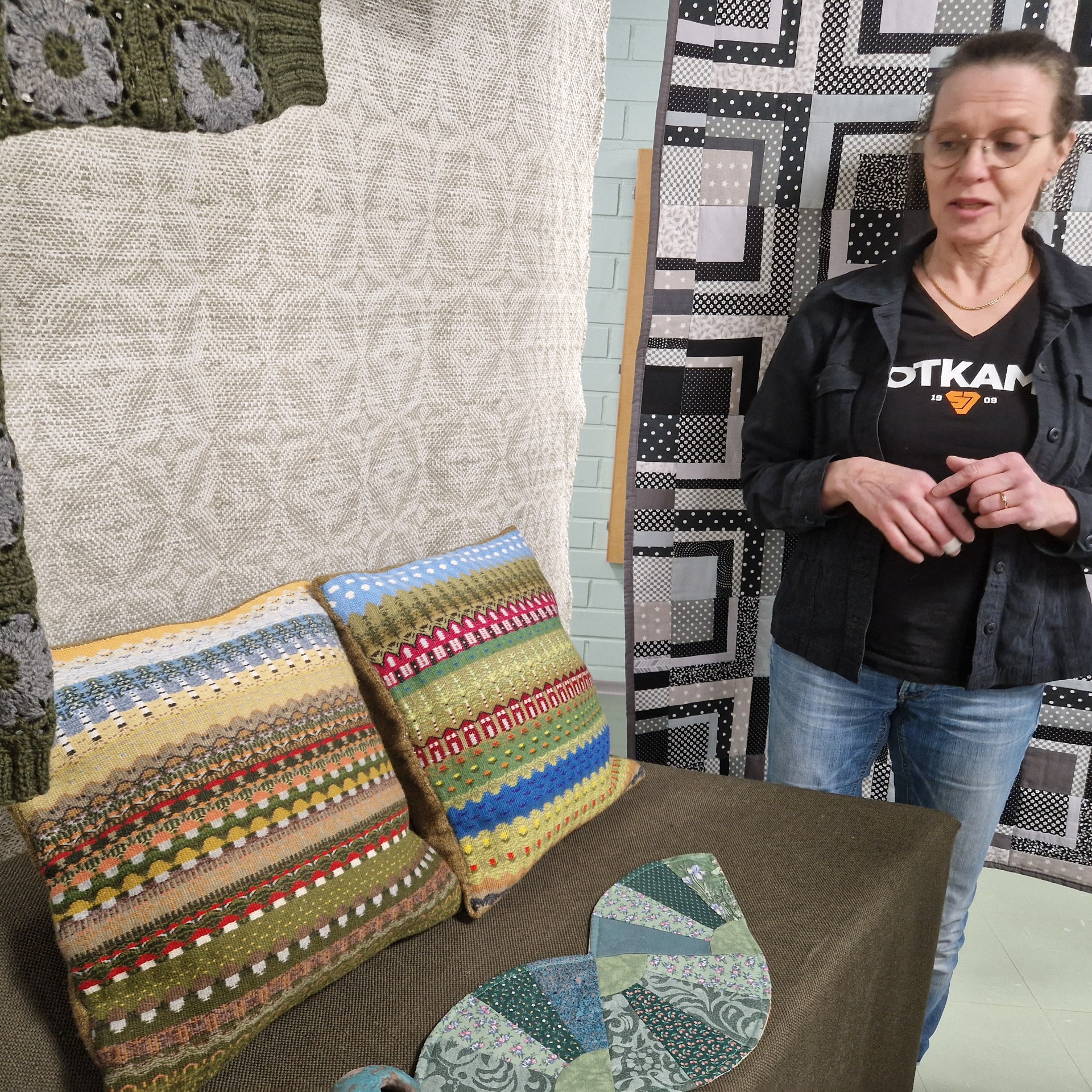 Tekstiilitöiden kädentaitojen piirien töitä on esillä monipuolisesti. Työt edustavat erilaisia tekniikoita ja niitä ovat tehneet kymmenet opiston piiriläiset.