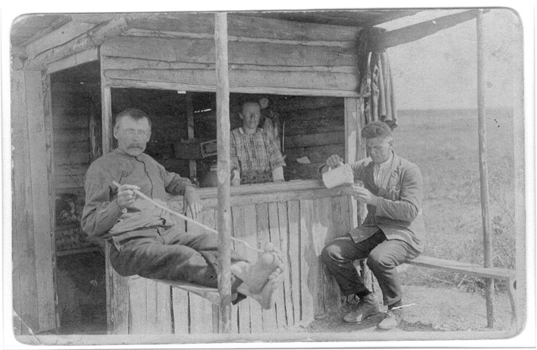 Reetta Luttisen pitämä kahvila rautatien rakentajille Kuonalla 1920-luvulla. Asiakkaina työnjohtaja Anderson ja Juho Pekola.
