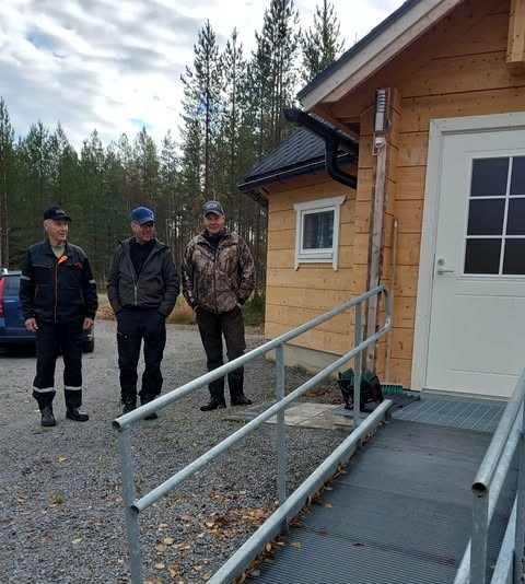 Uuden kodan edustalla Pohjoisen Metsästysseuran entinen pj Lauri Varila, nykyinen pj Jani Katvala ja Pasi Varila