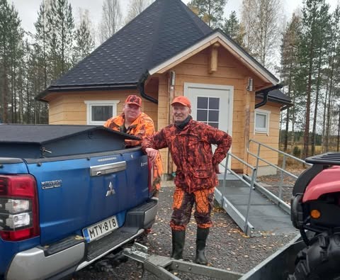 Tyytyväisä hirvimiehiä uuden kodan edustalla. Mikko Tulppo (vas.) ja Kalevi Ruhala olivat juuri tuoneet kaksi hirveä nylkyhallille