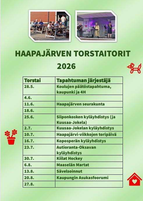 Vuorolistan kokoaminen on siirtynyt Haapajärvi-Seuran tehtäväksi, joten jos yhteisösi on kiinnostunut järjestämään edellä mainittuina torstaina tori-illan, niin laita sähköpostia yhteisokanava@haapajarviseura.fi , niin päivitämme vuorolistaa.
