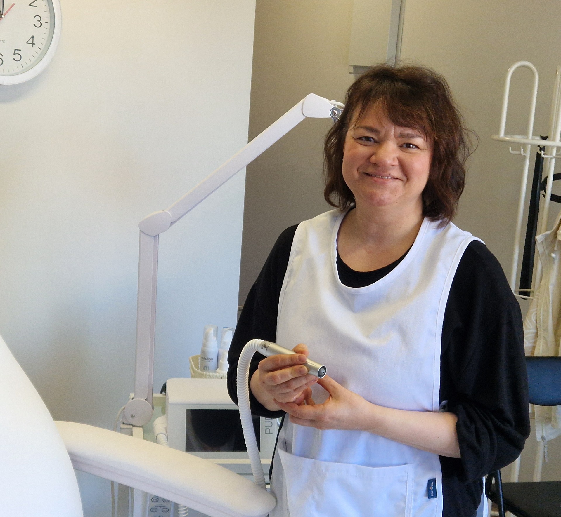 Riitta Kokkoniemi jalkojenhoitolan viihtyisissä tiloissa, joissa on uudet hoitolaitteet ja -välineet