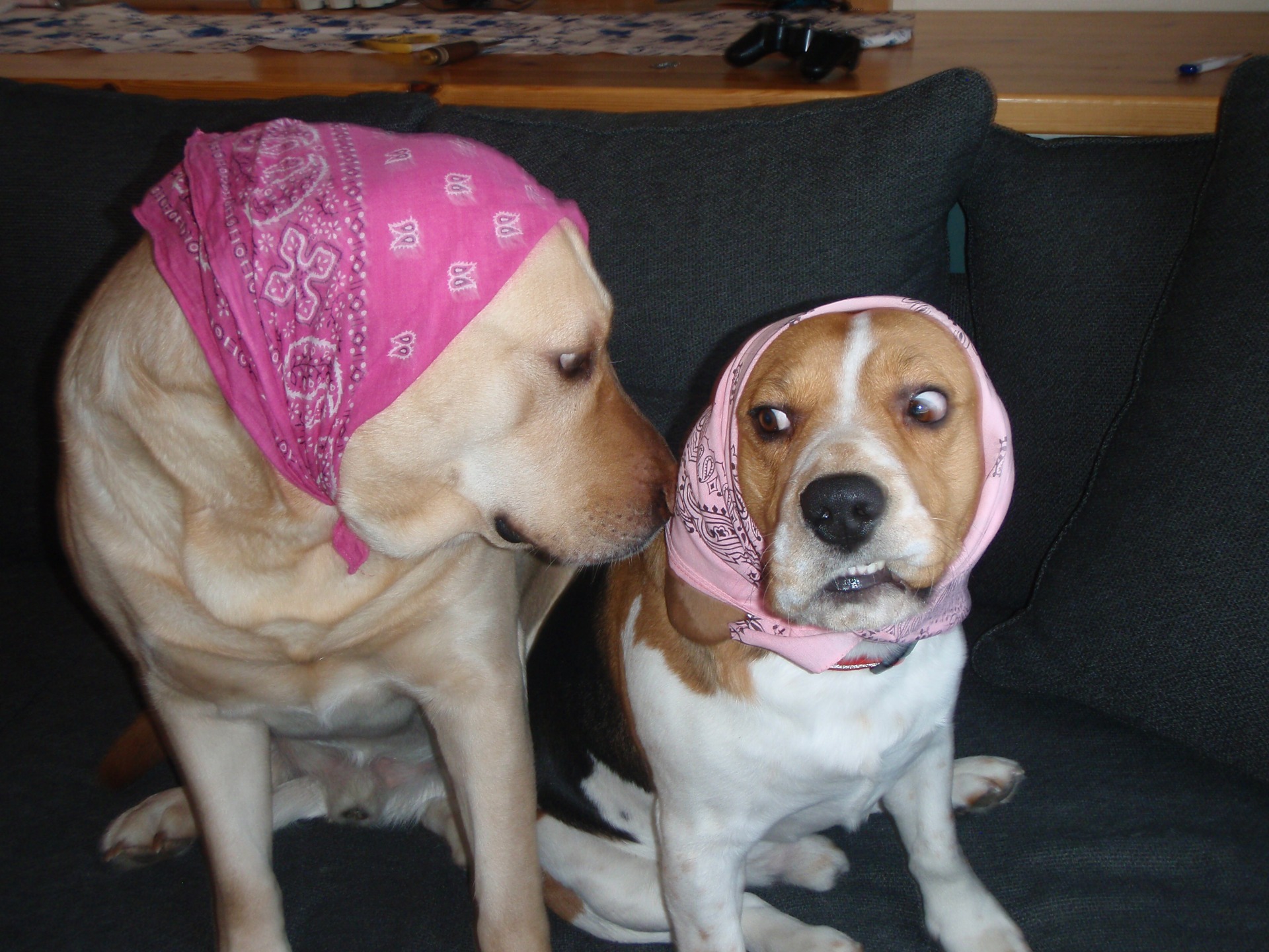 En kiistä sitä, että me ollaan hyvännäköset. Mutta kyllä paremmin rulliksi sopis eräs, jonka nimiä en mainihe. Kotirauhan takia sitä joutuu alistummaan melekosiin temppuihin. Ja sitten se kietas meijän päähän huivit, niin että meinas henkiriepua ahistaa. Otti kameran ja sano, että olokaapa oikein ilosen näkösiä. Kahtokaapa meikäkoiran naamaa! Että näytänkö iloselta?
