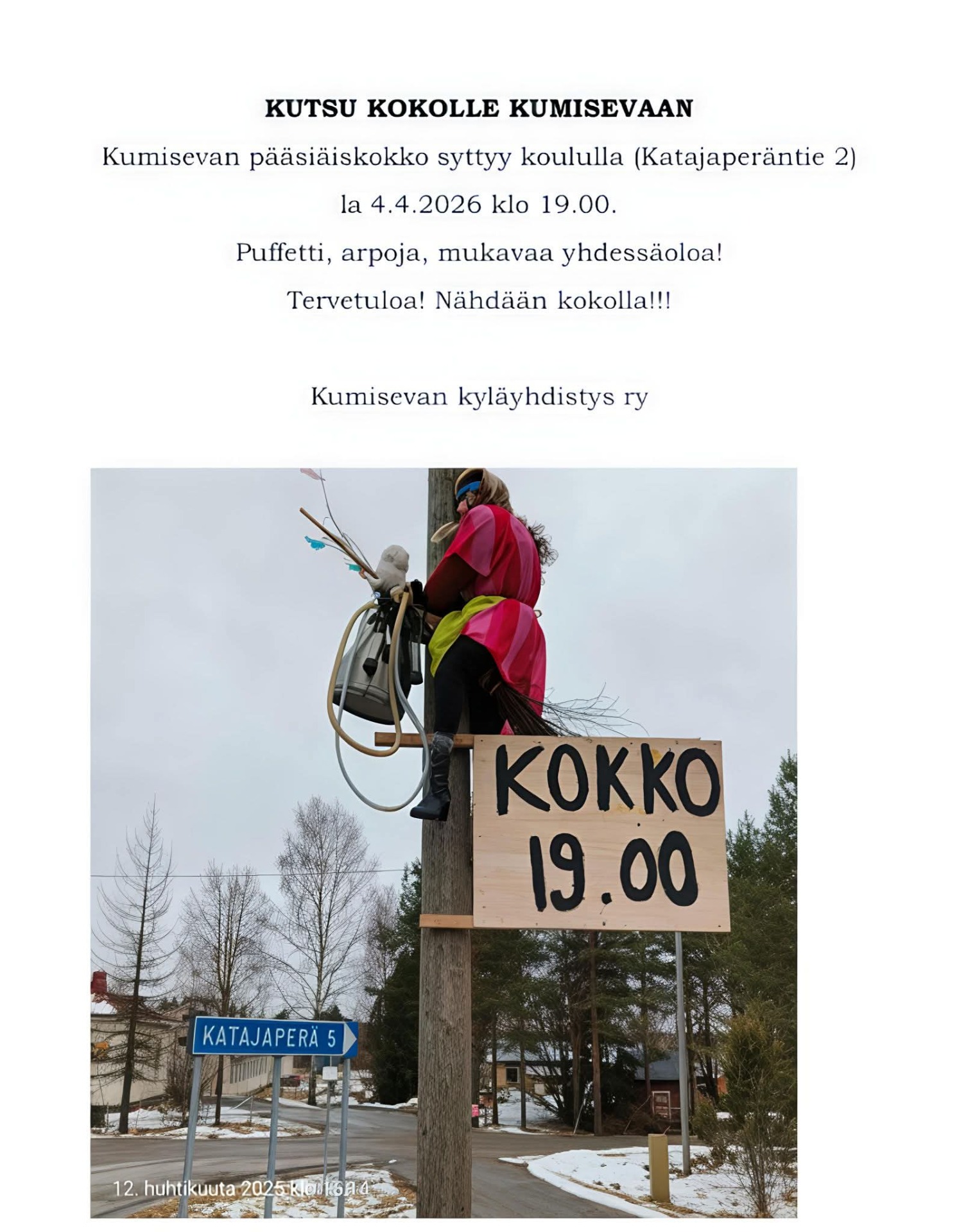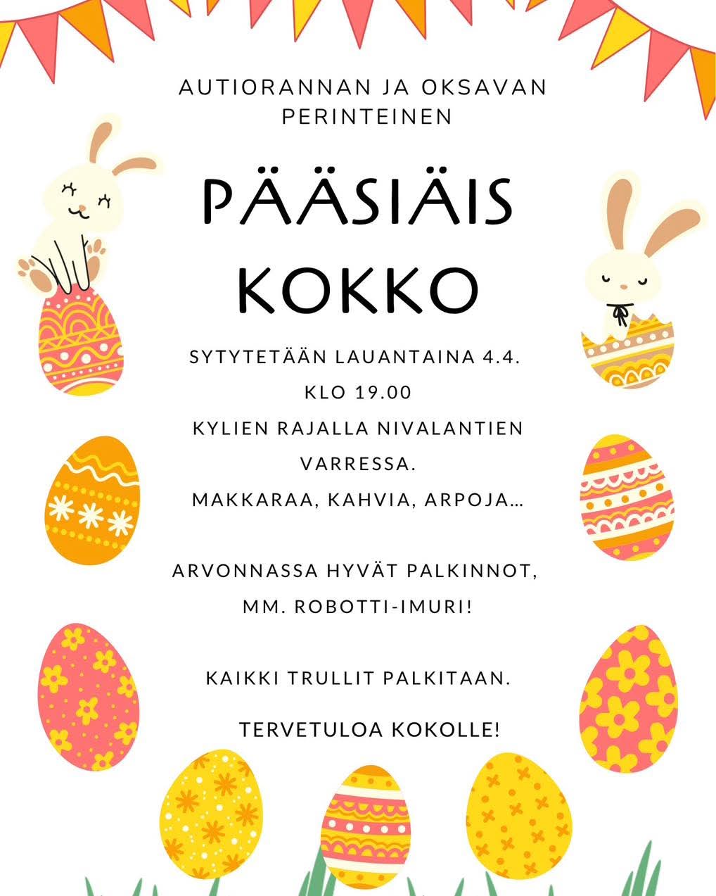 Keskipohjalaiseen malliin kokot syttyvät jälleen pääsiäislauantaina. Kyläyhdistyksillä on perinteiseen tapaan kokkotapahtumia, joissa on kokon lisäksi muuta ohjelmaa, kuten muun muassa arvontaa, makkaran ja kahvin myyntiä. Alla kyläyhdistysten tapahtumailmoituksia.