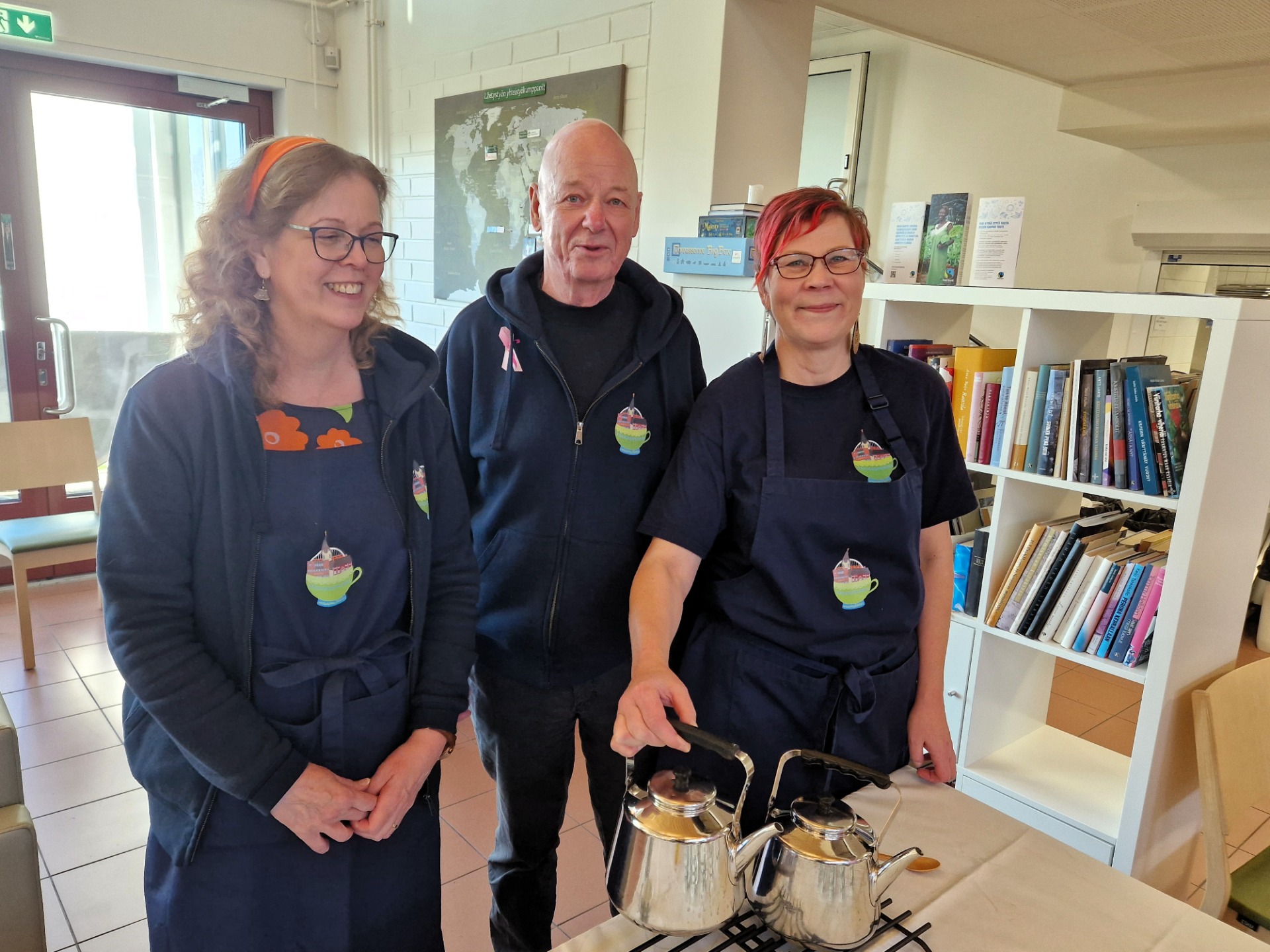 Teetoimikunnan Soili Pentikäinen, Erkki Leppälä ja Soile Kiviranta tarjosivat kävijöille Haapajärvi-teetä