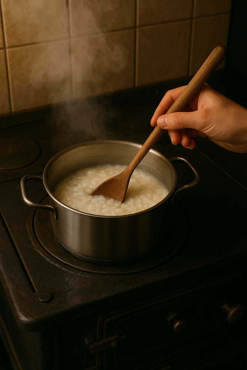 Keittäjä kuitenkin taas kolhii korvaani ja kiskaisee liedeltä; peläten, että poltan ryynit pohjaan. Kun ei muuta keksi niin kaataa maidon kylmänä sisälleni. Kyllä kai siitä säikähtää ja pohjaan polttaakin. Aina se on kattilan vika.