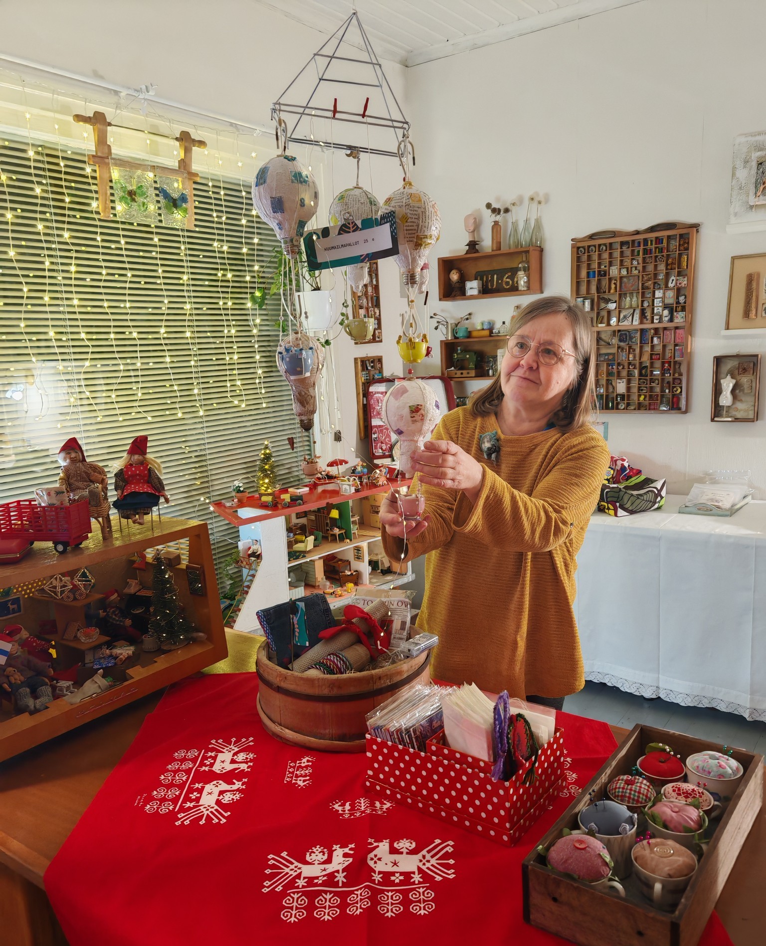 Haapajärvinen taidekäsityöläinen Tarja Pärn toivottaa vieraan lämpimästi tervetulleeksi työhuoneensa ovella Kuusaantiellä. Piha ja sisäänkäynti on koristeltu valoin ja kynttilöin. On ihanan tunnelmallista.