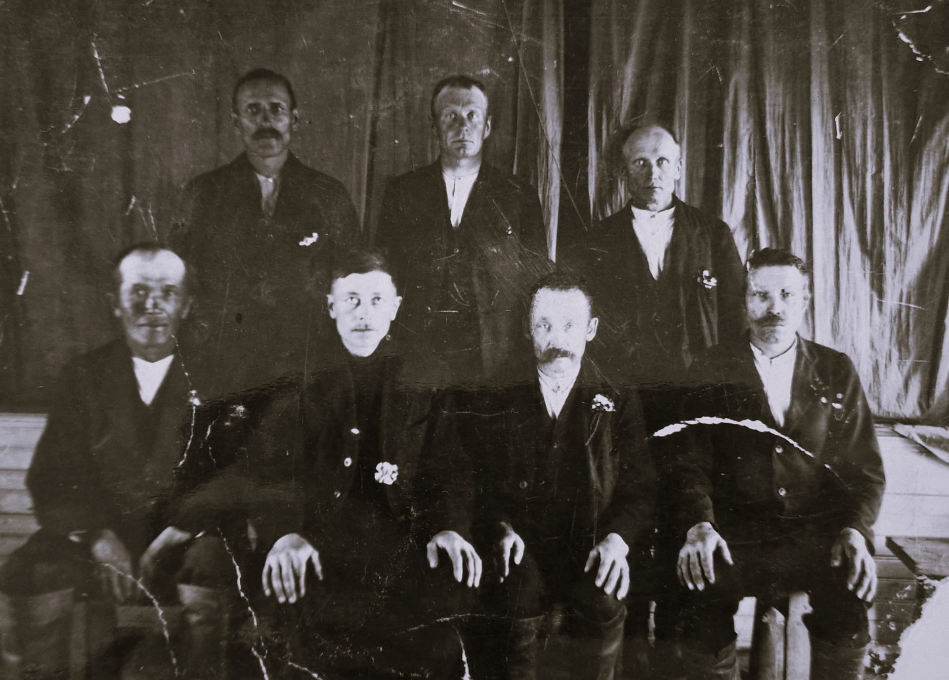 Haapajärvellä on ollut myös kylien työväenyhdistyksiä. Kuvassa Oksavan yhdistyksen ensimmäinen johtokunta viime vuosisadan alkuvuosikymmeninä.