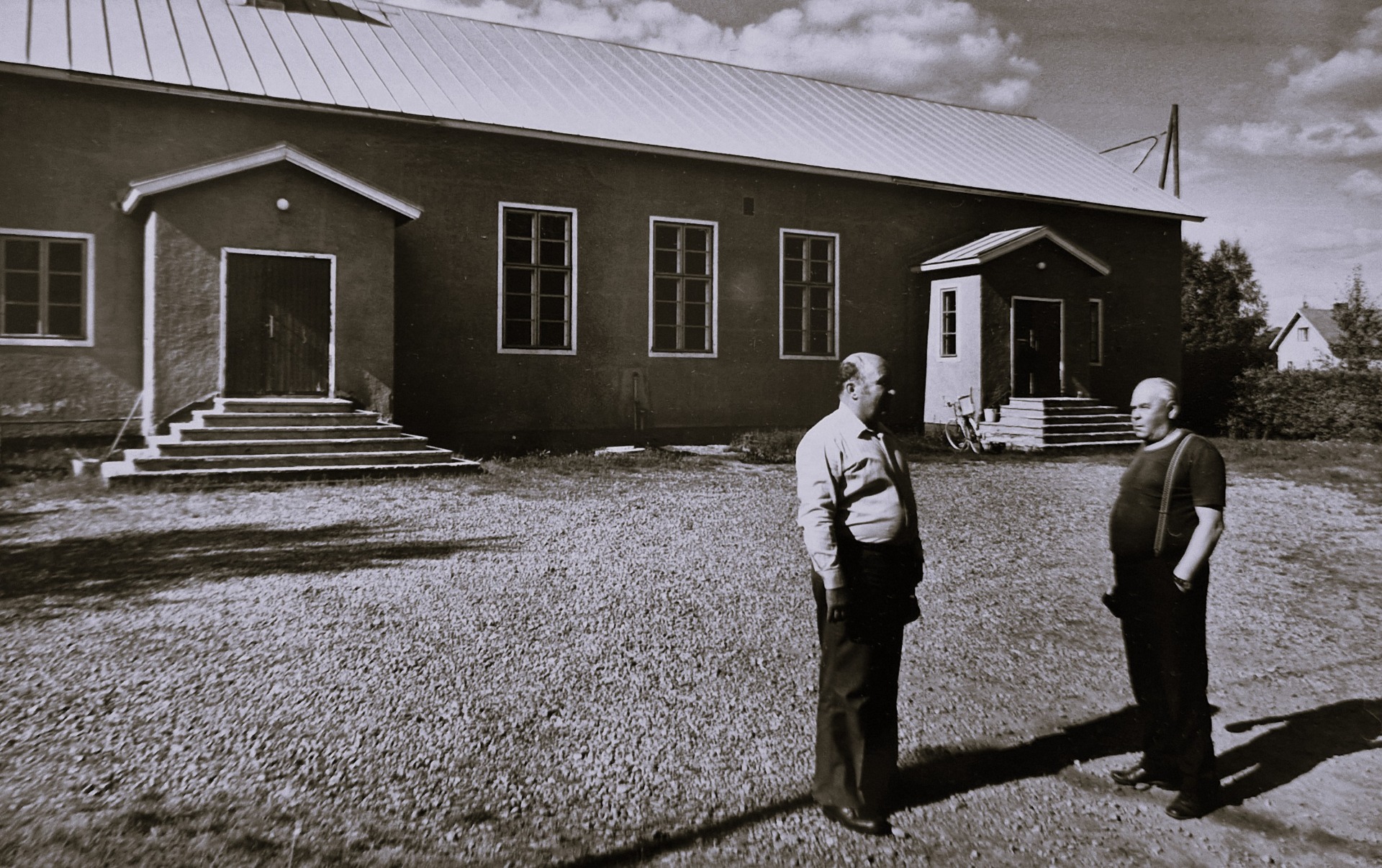 Työväenyhdistyksen oman aikansa pitkäaikaiset aktiivitoimijat ja puuhamiehet Martti Tossavainen (vasemmalla) ja Niilo Orava työväentalon pihalla 1980-luvulla.