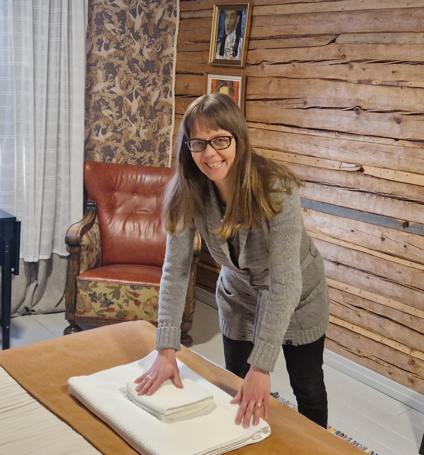 Marika huolehtii, että Väinön kammarissa on kaikki kunnossa seuraavaa yöpyjää varten.