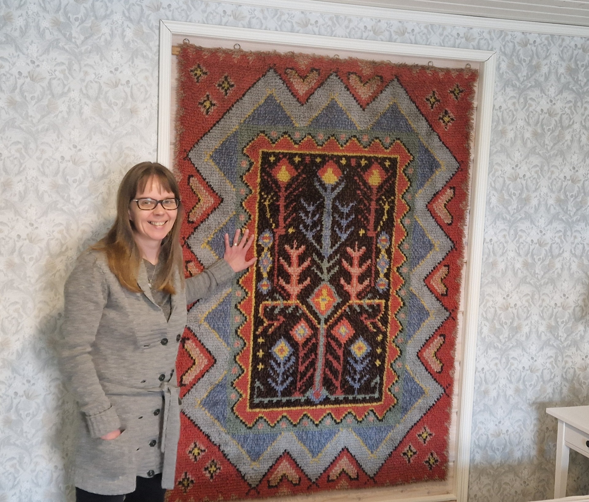 Marika esittelee Gunillan kammarin upeaa ryijyä.