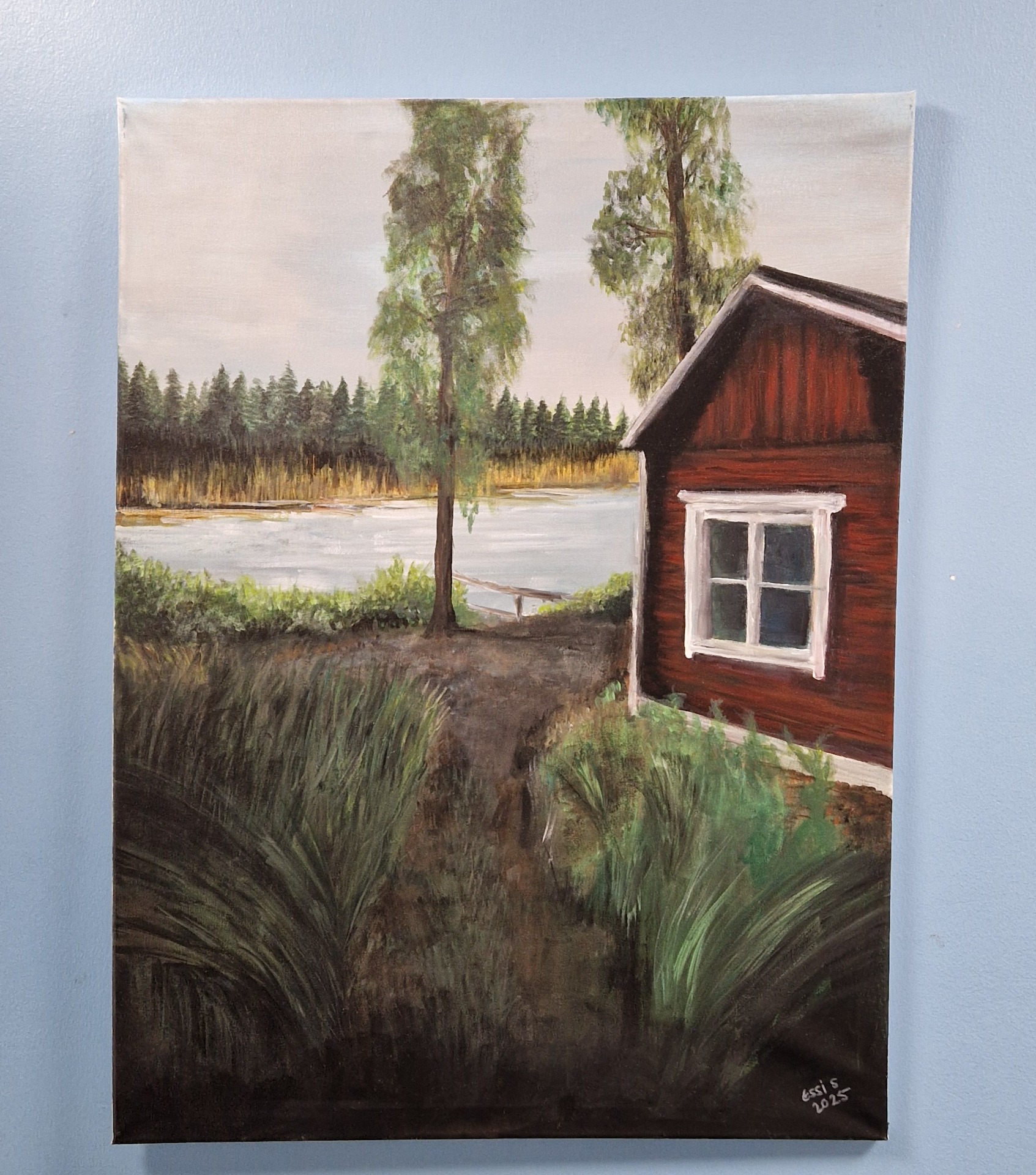 - Työssämme on rauhallinen kaunis maalaismaisema, kertoo maalaukset tehnyt kolmikko työn aiheesta.