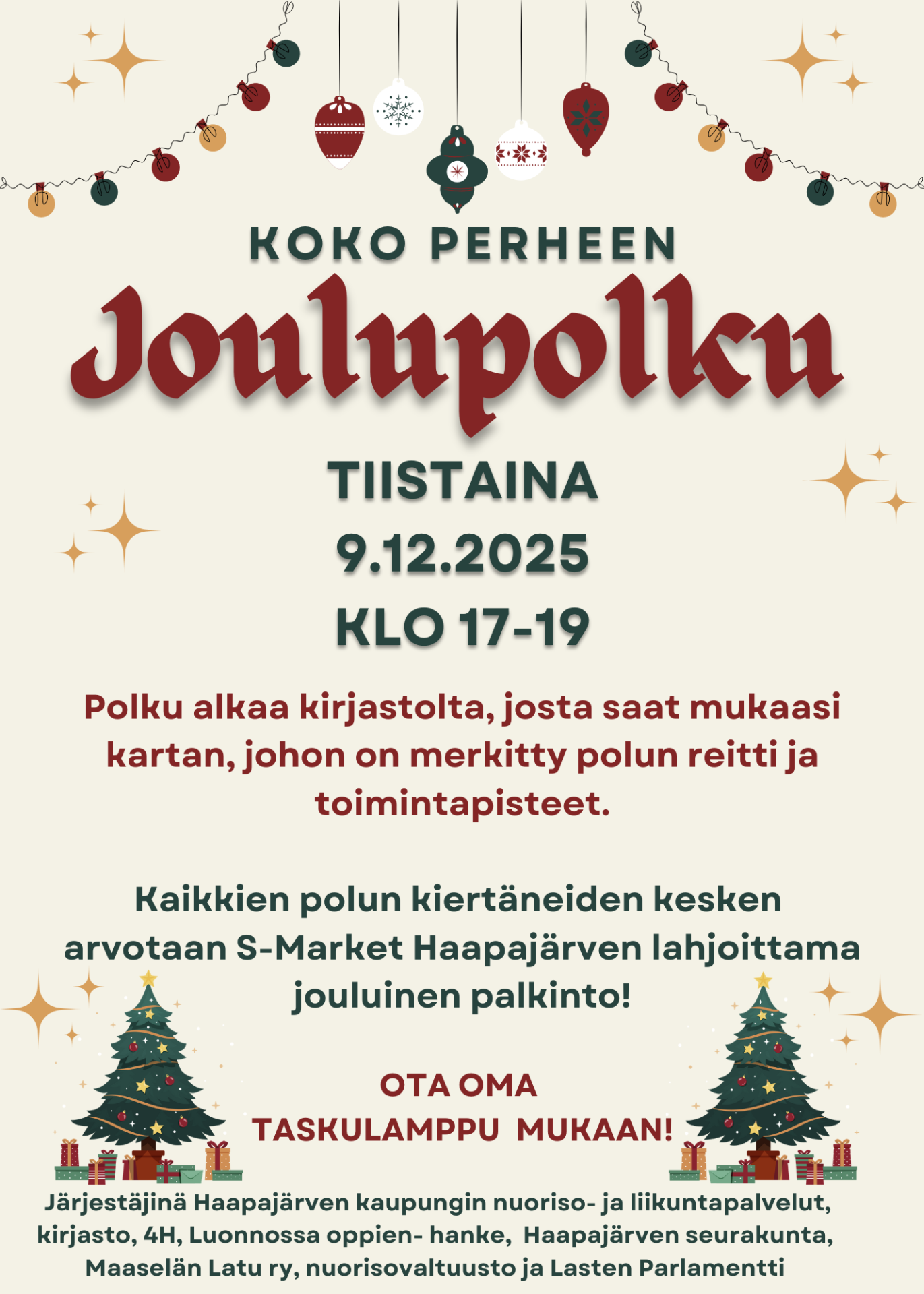 Päällekkäisten tapahtumien vuoksi koko perheen Joulupolku- tapahtuma on siirretty pidettäväksi tiistaina 9.12.2025 klo 17-19. Ennakkotiedoista poiketen polku alkaa kirjastolta (ei kaupungintalolta) , josta saat mukaasi kartan, johon on merkattu polun varrella olevat toimintapisteet.